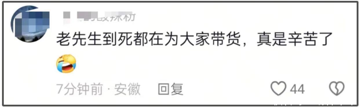 不少网友得知杨少华去世消息后,纷纷在评论区质疑儿子的疑惑行为,还有的直接批评称“儿子们榨干了老爷子最后一口气 ”,愤懑之心冲破屏幕。而后,该条带货视频被删除,恐怕是无法接受沦陷的评论区。