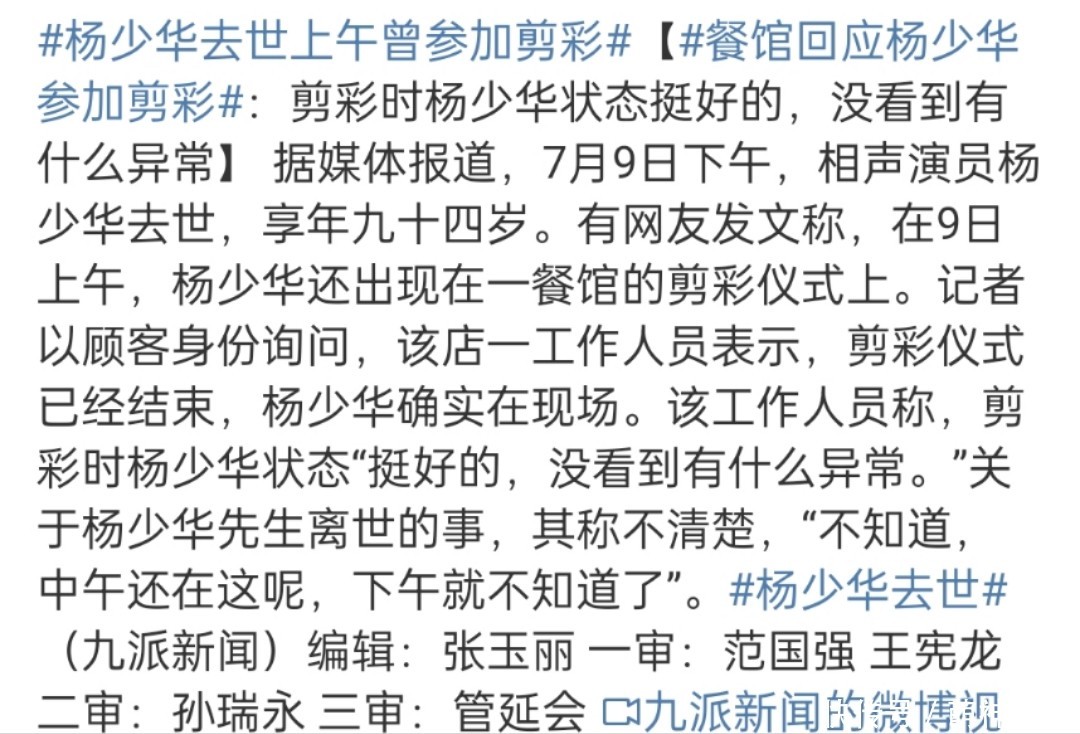 最后,祝杨少华老先生一路走好,也希望家人们能好好告别。